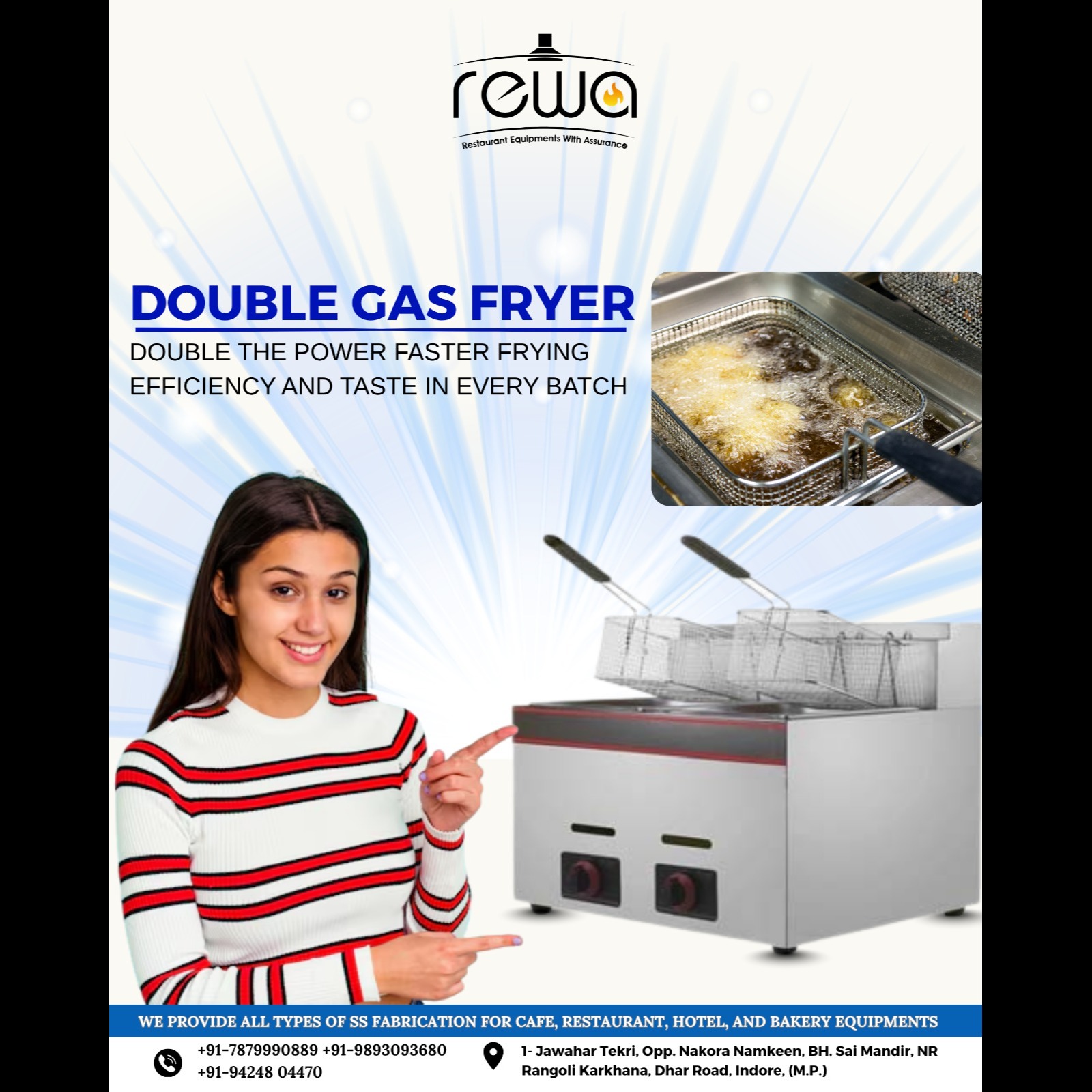 π DOUBLE GAS FRYER π₯ Double the Power, Faster Frying Efficiency, and Taste in Every Batch! πβ¨ Perfectly crispy, golden results β every single time! π¨βπ³ Contact: +91-7879990889, 91-9893093680, +91-94248 04470 Location:- 1- Jawahar Tekri, Opp. Nakora Namkeen, BH. Sai Mandir, NR Rangoli Karkhana, Dhar Road, Indore, (M.P.) https://www.rewarefrigeration.com/